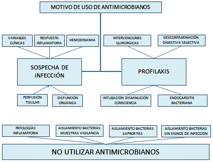 Motivos para la prescripción de antimicrobianos. Sospecha de infección. Profilaxis. Tiempo en iniciar el tratamiento. Situaciones clínicas en las que no hay que indicar antimicrobianos
