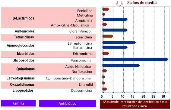 De todos los antibióticos utilizados se ha descrito resistencia, con más o menos latencia entre el tiempo de comercialización del antimicrobiano y la descripción de la resistencia, como se ve en la figura 1.