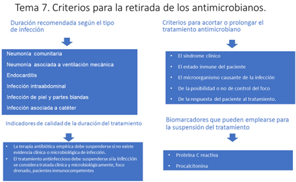 Criterios para la retirada de los antimicrobianos. Criterios clínicos. Criterios biológicos (biomarcadores). Marcadores de calidad en la duración de los tratamientos. Criterios para acortar o prolongar el tratamiento