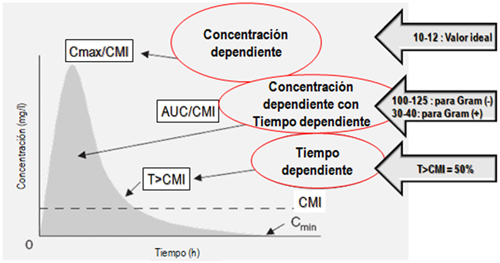 - Concentración dependiente con tiempo dependiente. El objetivo ideal es 100-125 para los microorganismos Gram (-) y de 30-40 para los Gram (+)