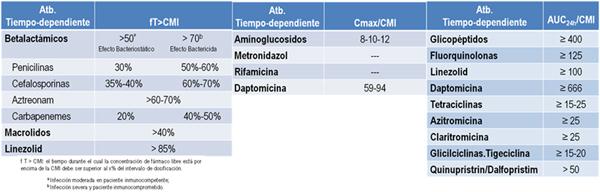 La tabla 2 muestra la clasificación de los antimicrobianos en función de los índices predictores de eficacia PK/PD15