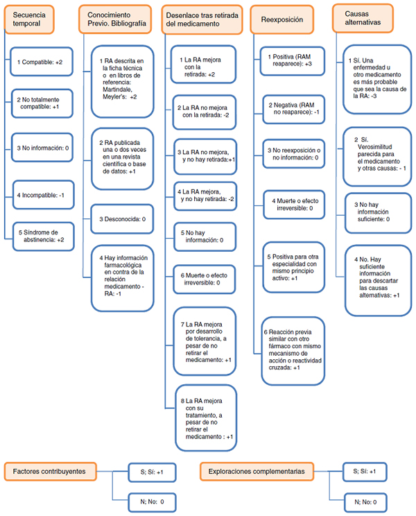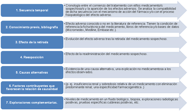 Dicho algoritmo consta de 7 preguntas o criterios, que el clínico o el evaluador se plantea ante una pareja medicamento-efecto adverso: