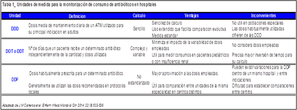 Deben monitorizarse todos los ATM utilizados en el hospital, haciendo un análisis global y estratificado por familias e individual de cada antimicrobiano, con especial atención a aquellos con mayor impacto ecológico, asistencial y económico. Las principales unidades de medida sobre el consumo de ATM se describen en la tabla 1.